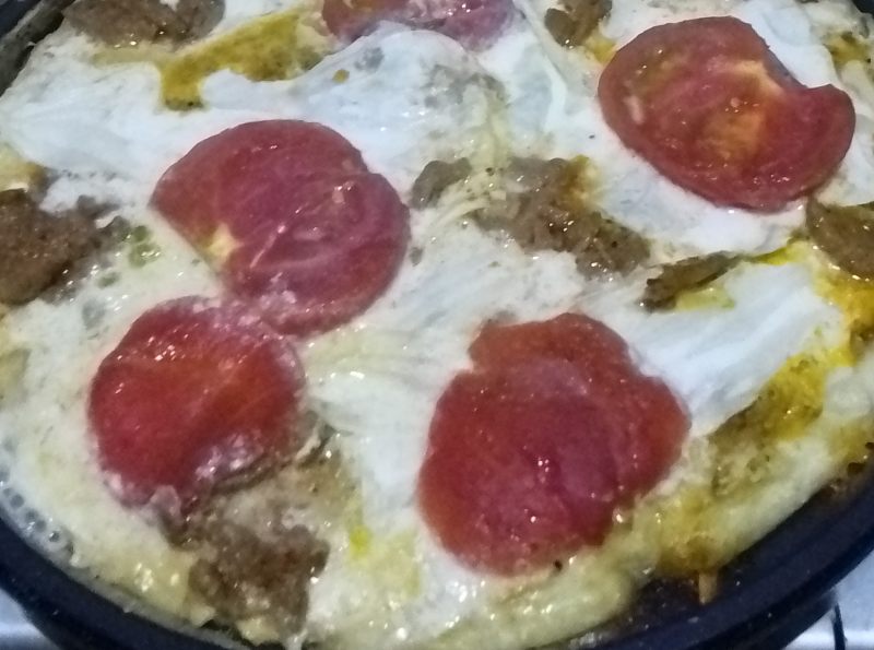 4:涂上黑椒汁,再一次加入鸡蛋,白菜,里脊肉,番茄。
