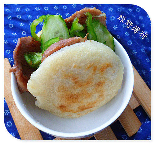 8:将里脊片夹烧饼里,根据个人口味,抹上辣酱,甜面酱,夹蔬菜即可。