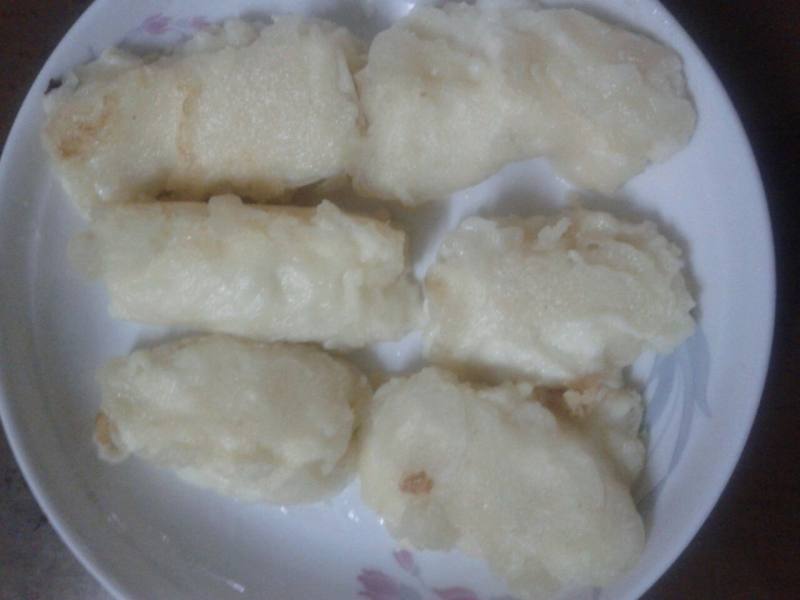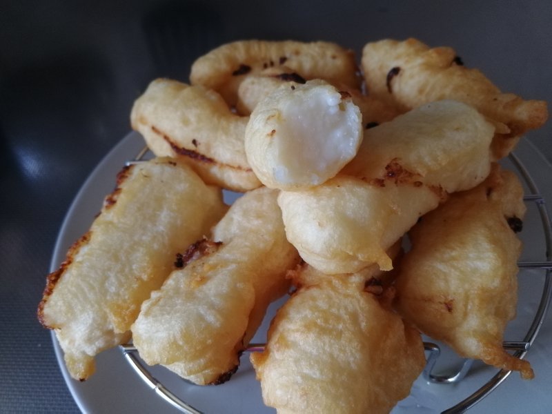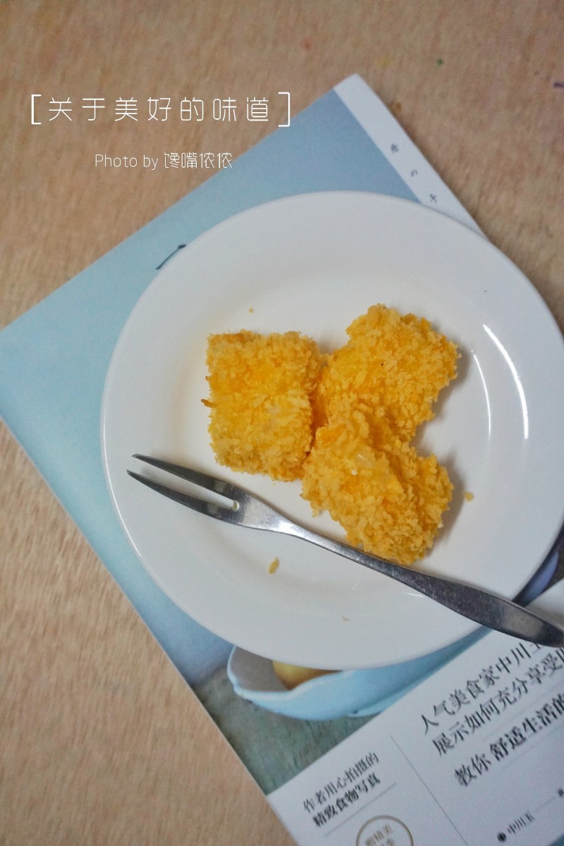 6:切好的牛奶块放入面糊中,裹上一层面糊,放入油锅中炸至金黄色即可