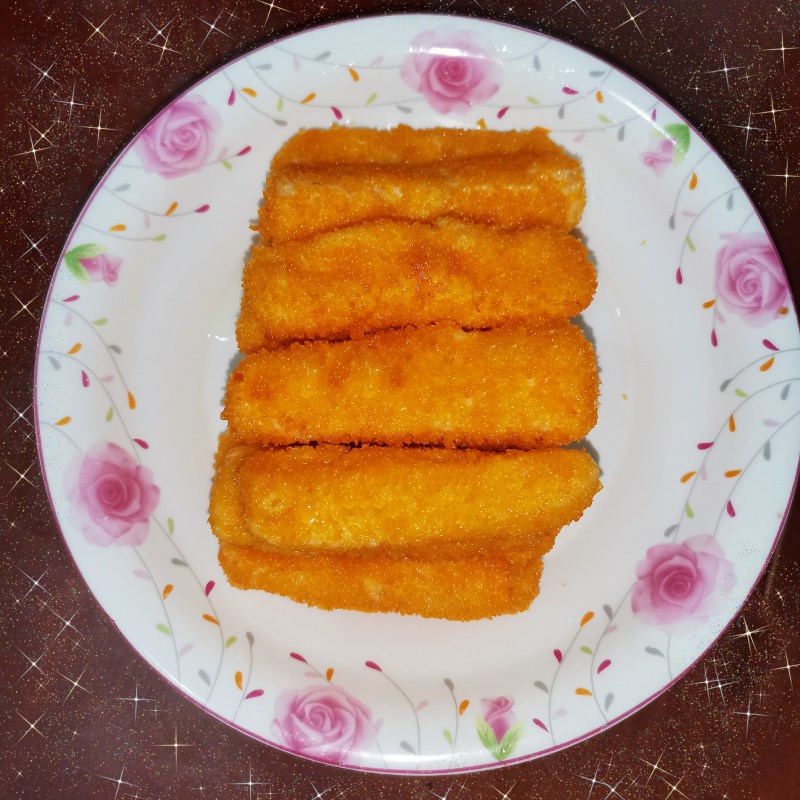 5:倒扣出来,切成小条,按着低粉 蛋液 面包糠的顺序完成操作。