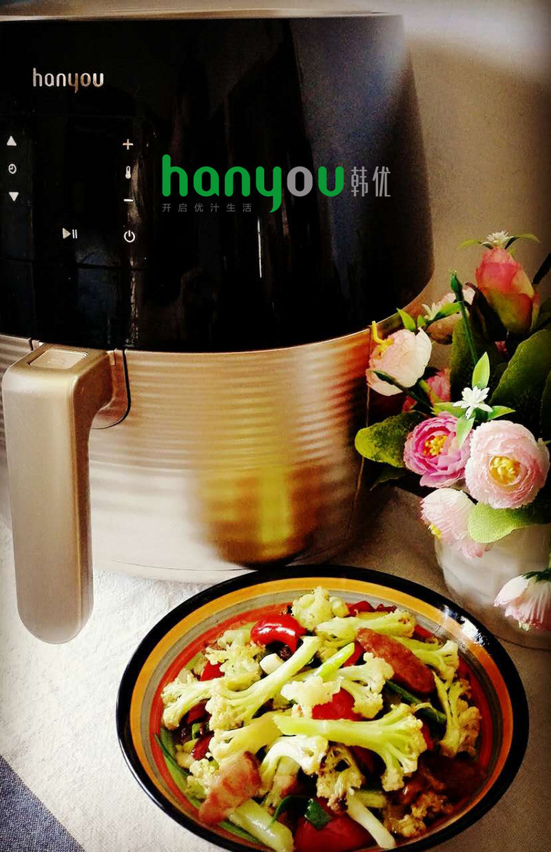 1:把花菜洗净切成小朵加入少许盐、生抽、红辣椒、椒盐粉拌匀腌制20分钟再加入切片的香肠加入少许橄榄油拦匀