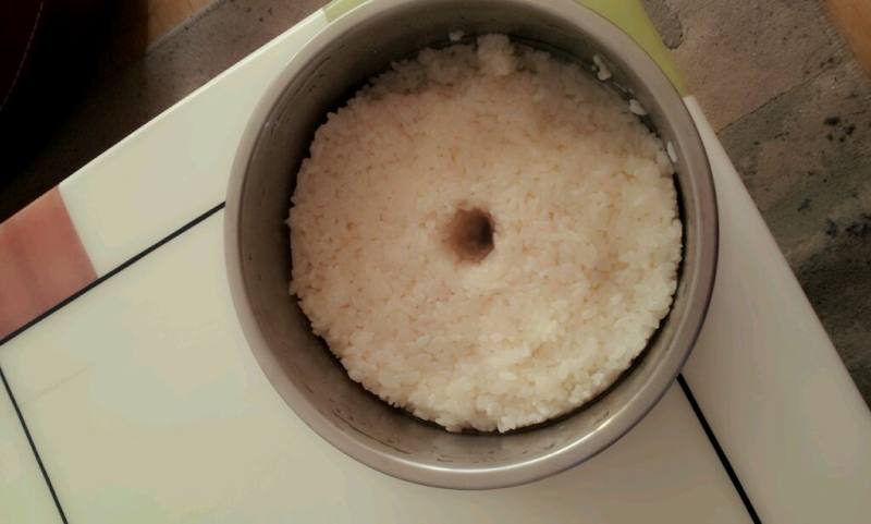 8:取一干净无水无油的容器,玻璃或者陶瓷的最好,将米饭转入容器中,稍微按一下,然后再中间压一个小酒窝。将之前剩的酒曲兑三调羹的温开水化开,均匀地浇在表面。
