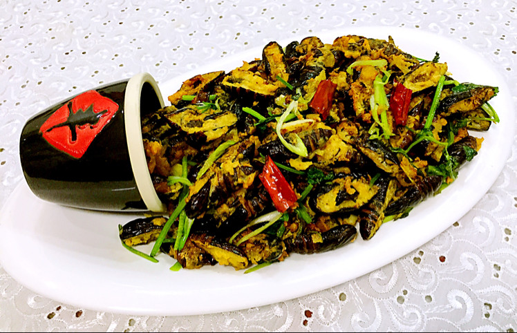 14:干煸蚕蛹就炒好了(不要炒制时间太长,蚕蛹会面不酥脆影响口感)
