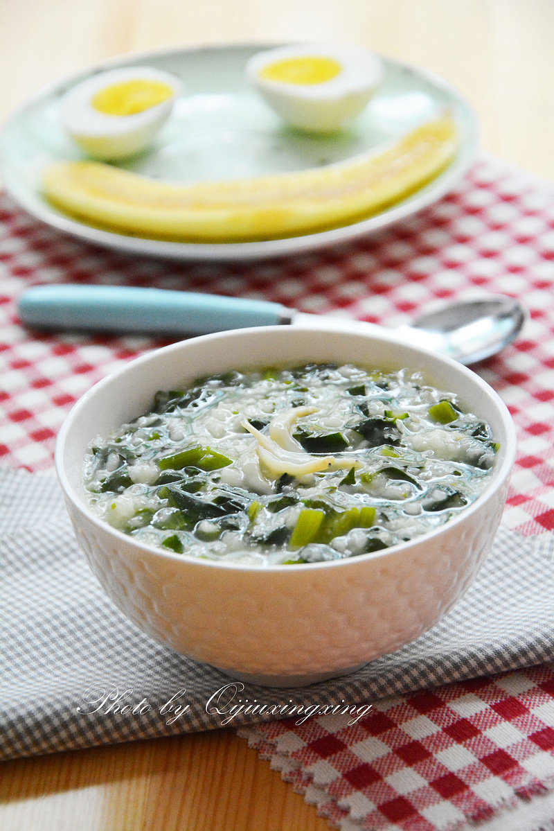 菜茧切碎之后稍微炒一下,煮出来的粥颜色会更鲜亮,而且菜的颜色也会是碧绿碧绿的。干银鱼比较不容易煮烂,所以要提前一晚浸泡,并且和大米一同下锅煮。