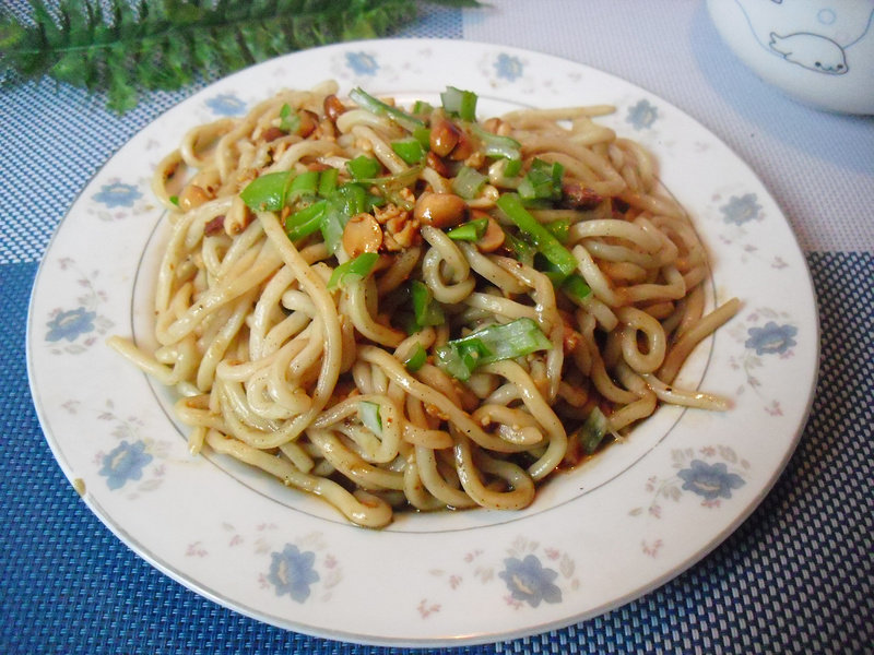 3:备好面条,花生碎,葱花,酱油 辣椒油 味精 胡椒 糖 香油调成汁.