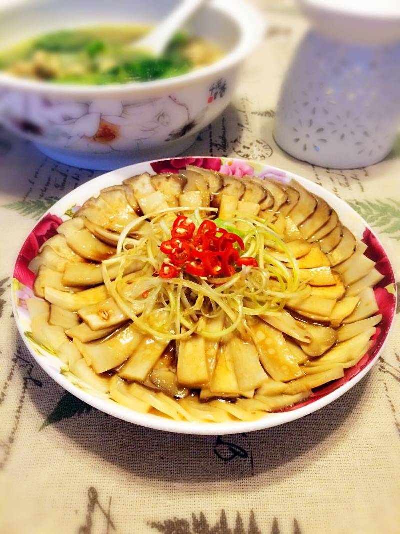6:将蒜末放杏鲍菇片的中间,上面再铺上葱丝,最后把泰椒圈放最上面。(这步忘拍照了)