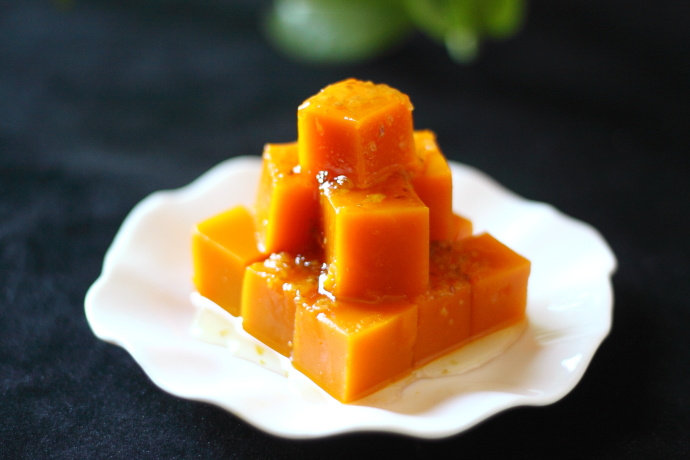 11:将保鲜盒放冰箱中冷藏一晚取出倒扣脱模,切小块装盘,淋上糖桂花