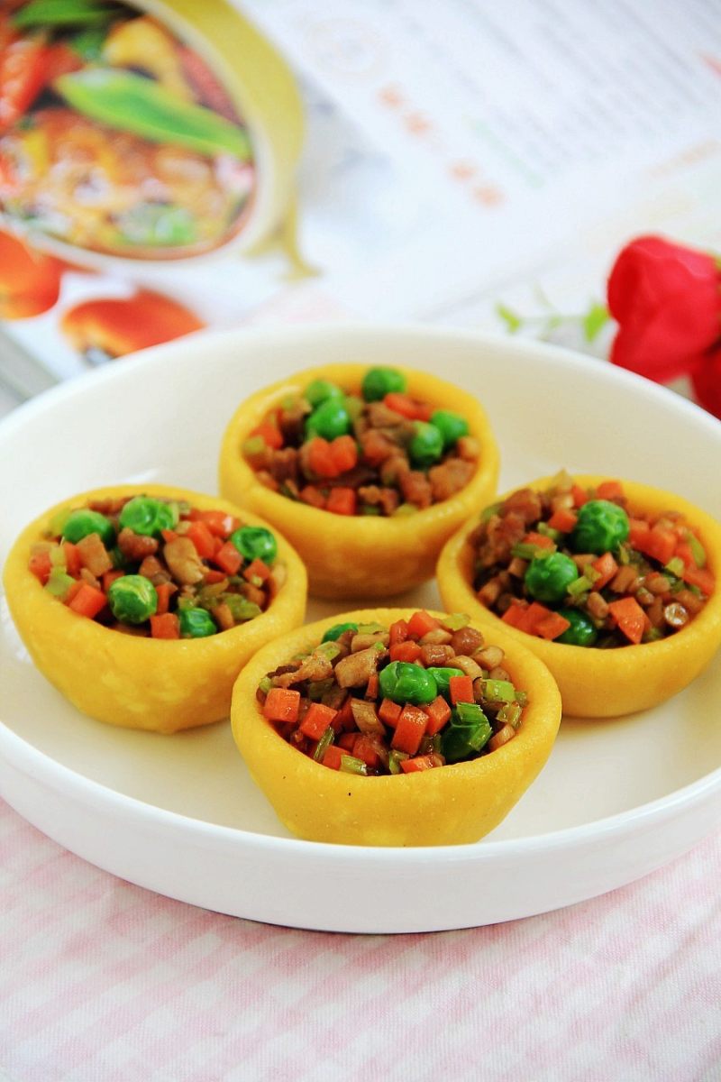 8:加入胡萝卜、芹菜、茶树菇,豌豆粒一起翻炒至熟,加入盐,老抽,胡椒粉,味极鲜酱油炒匀后起锅,把炒好的肉末装进蒸好的窝窝头中即可