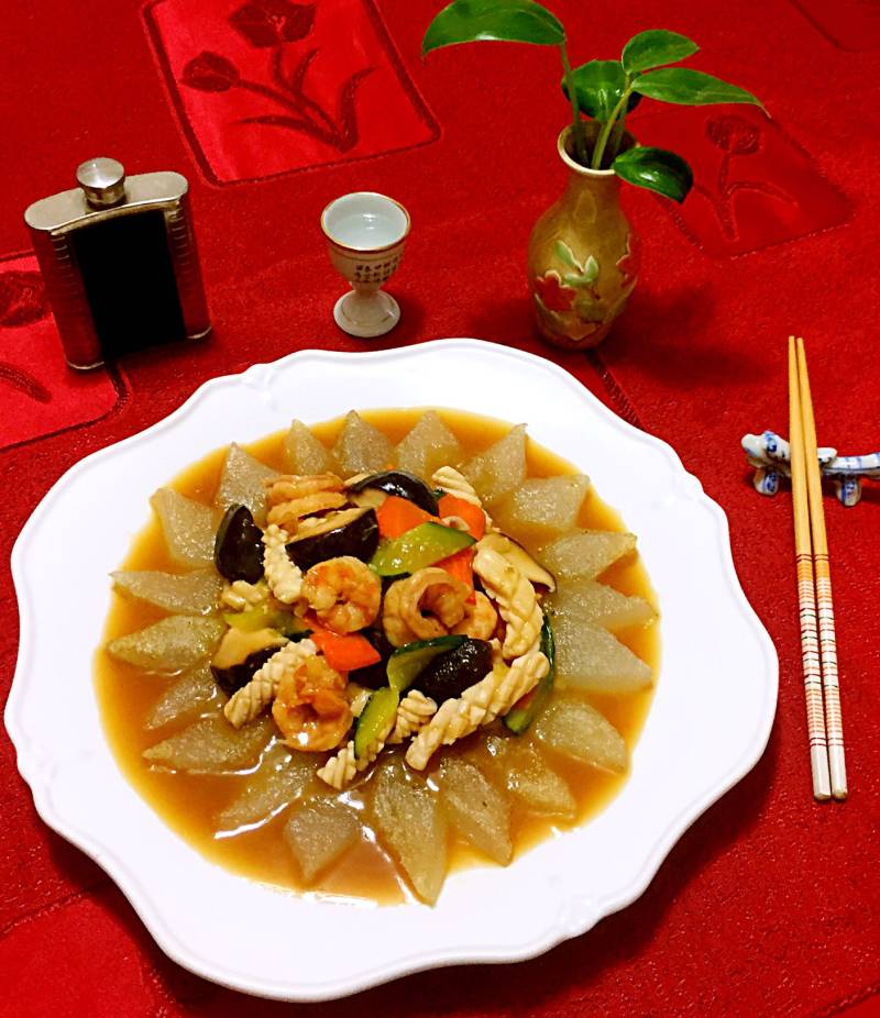 姜3克;鱿鱼200克;黄瓜100克;鲜虾150克;蒜10克;葱5克;香菇150克;焖子600克;胡萝卜100克;