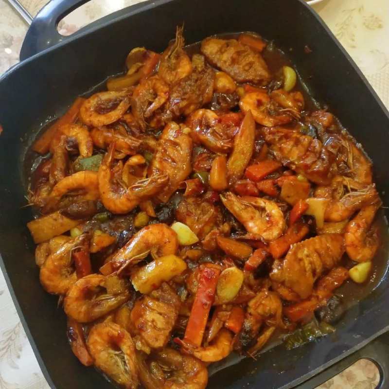 3:第三步:小焖锅或砂锅下面放少许油,散点圆葱,蒜子垫底,把鸡肉先放进去闷一分钟为了更好去掉腥味,然后加入汤汁,放入提前预制准备好的食材,例如:花甲、虾、青菜等。煮熟后大火收汁即可