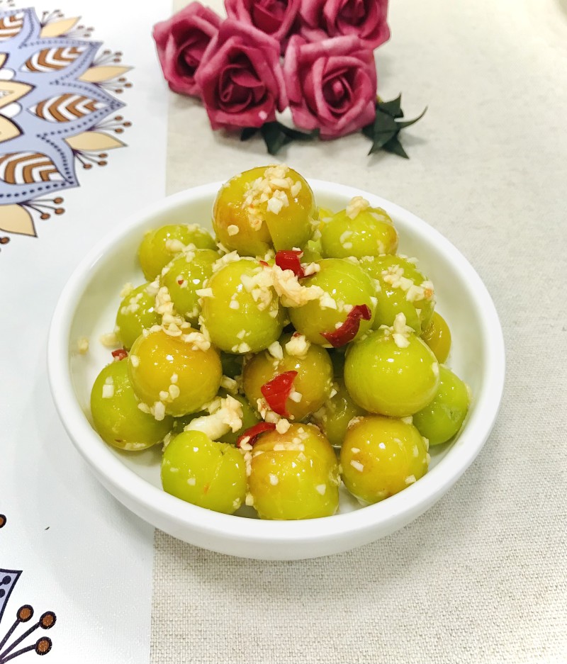 2:李子洗干净,用刀拍一下,蒜、辣椒搅碎备用。