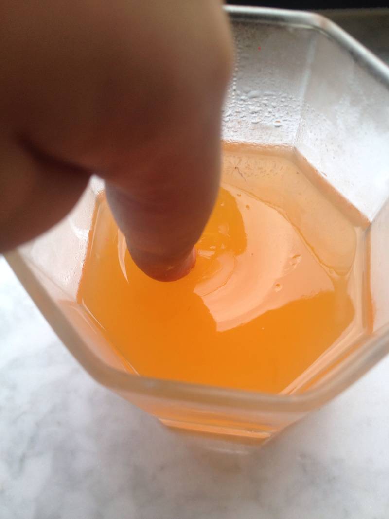 3:把溶解好的水倒入先前的果汁中,再搅拌几下。然后将液体放入果冻磨具中,在冰箱冷藏至凝固即可。我一般是晚上做,第二天吃。
