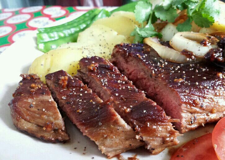 6:我喜欢八成熟的,切开牛扒中间微红,有红色肉汁流出。