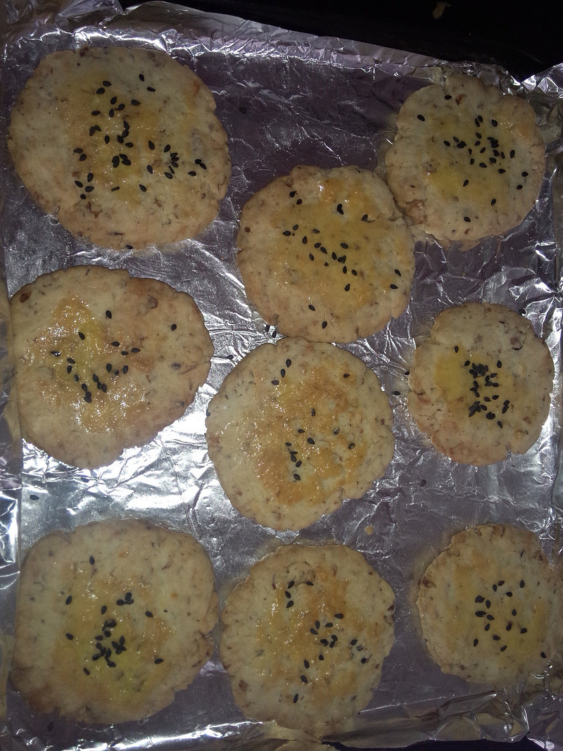 4:分成一个个小团,按压成圆形。放入烤箱170度,烤20分钟,快出锅之前,刷上蛋黄,撒上黑芝麻,烤2。3分钟出锅即可。