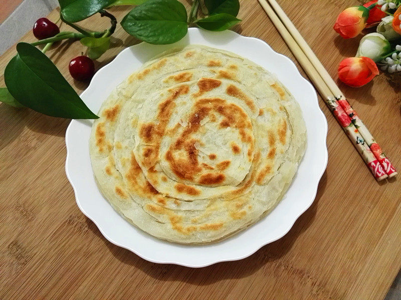 13:底面烙制成形后,将饼翻面烙另一面,两面成金黄色时,饼用手按压有弹性时,即可取出食用(要盖上锅盖,防止水分流失多)。