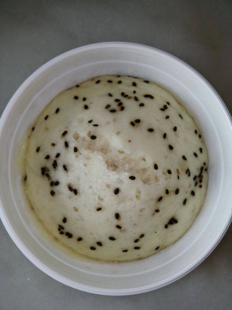 2:面粉中加入2克酵母粉、10克黑芝麻混合均匀,加入温水揉成光滑的面团醒发至两倍大。(面粉的吸水性不同,水量大约在110至120克之间)。