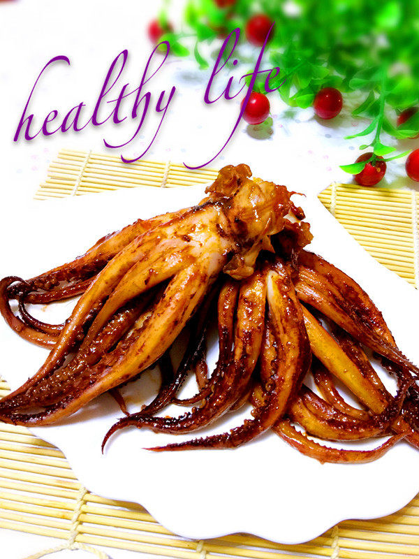 鱿鱼须180克;韩式辣酱1勺;孜然粉0.5匙;黑胡椒粉0.5匙;橄榄油10ml;