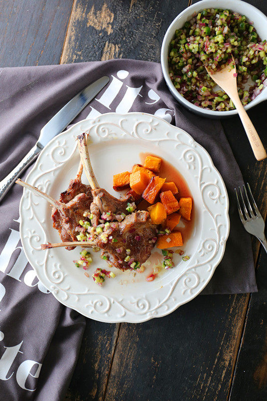 9:取出烤好的南瓜块盛入盘中,码上羊排,撒上做好的小黄瓜沙拉即可。