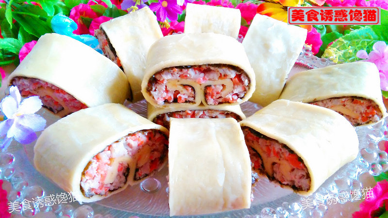 6:表面铺好肉沫卷起来。