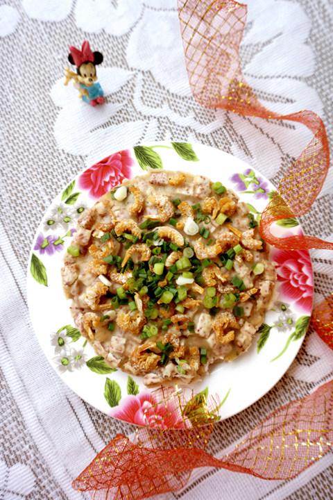 1:用料:香芋150克,海米10克,火腿2片,粘米粉50克,水75克,盐0.5克,酱油1/2小勺,糖1/4小勺,葱2根