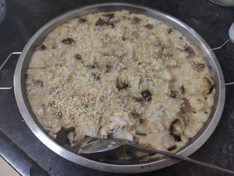 5:糕盆抹油倒入粉浆中火蒸25分钟