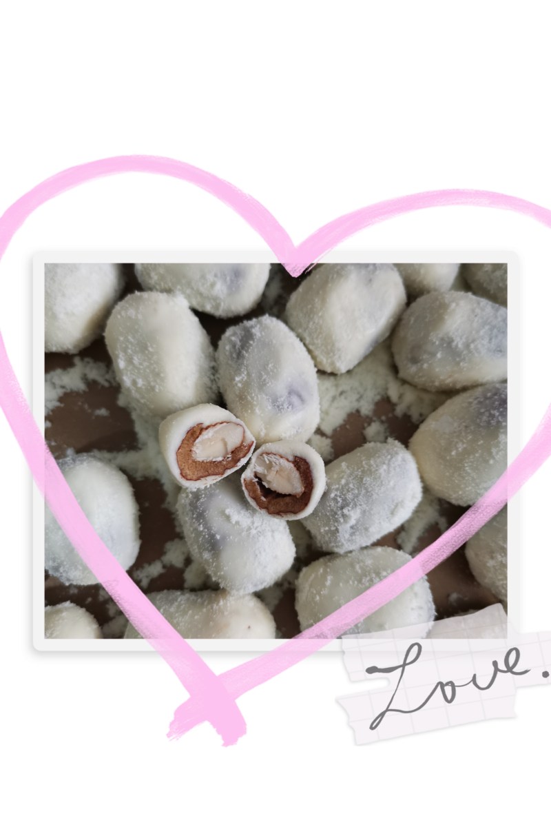 9:将杏仁枣一颗一颗揪出来,搓圆,在裹上干奶粉。奶香味十足的杏仁枣就做好啦!