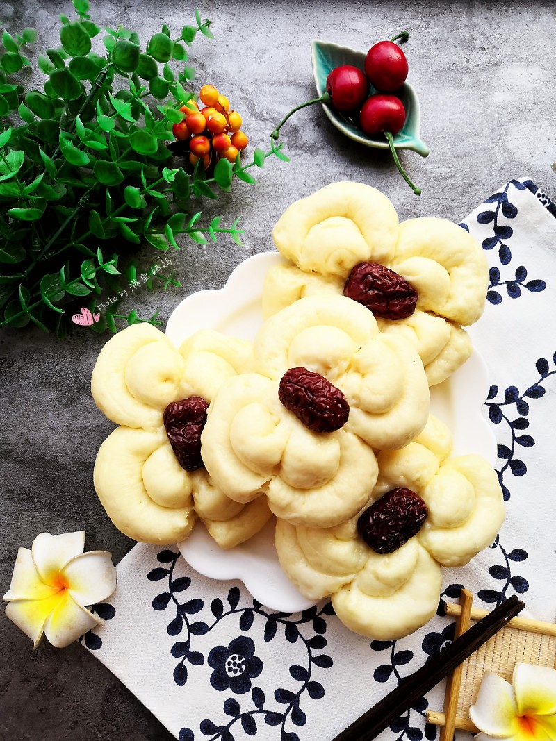 13:在中心位置按上一颗红枣,红枣可以涂些水沾在馒头上。
