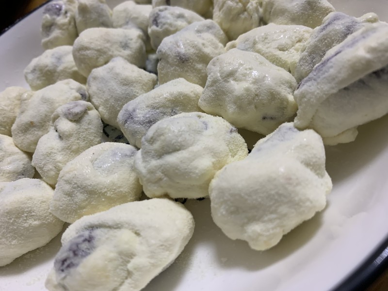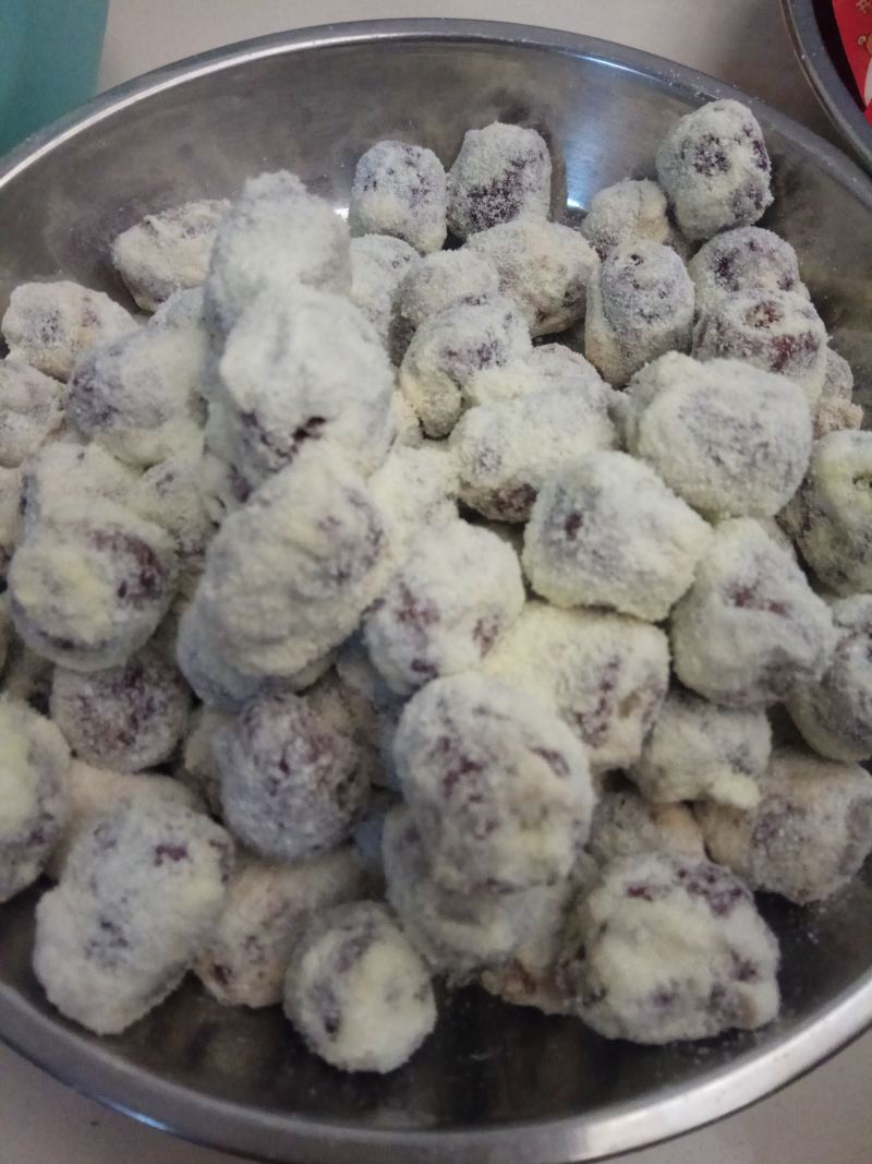 11:把搓好的奶枣在粉粒滚一下,让表面均匀的沾上粉。如果只在表面裹奶粉就是原味的。但斑斓味的更好吃。