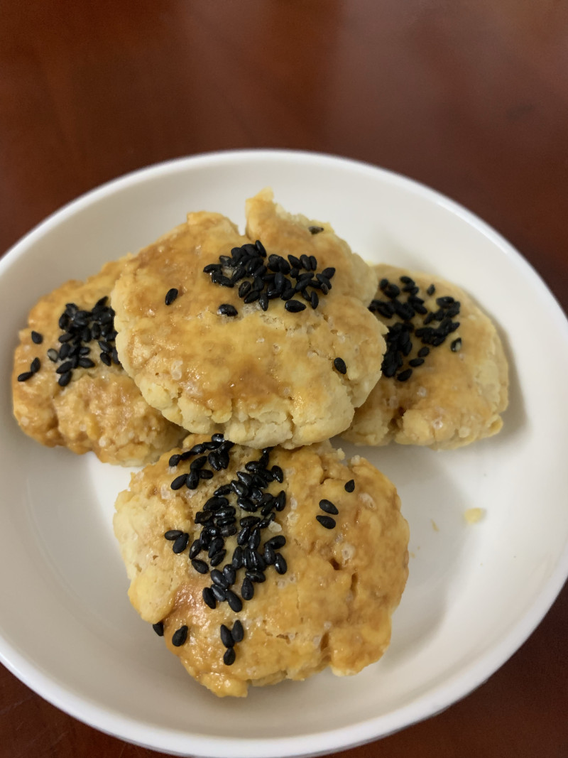 3:分成小团,用手按扁,刷蛋液,撒适量黑芝麻。
