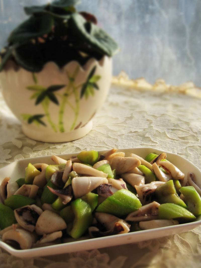7:然后,合入焯好的鱿鱼翻炒一下。
