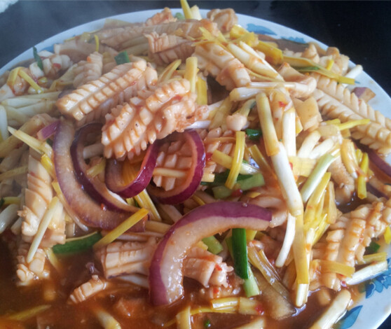 3:油锅小火煸炒辣椒酱,放五香粉,鱿鱼翻炒,加盐调味放蒜黄洋葱,快速翻炒。