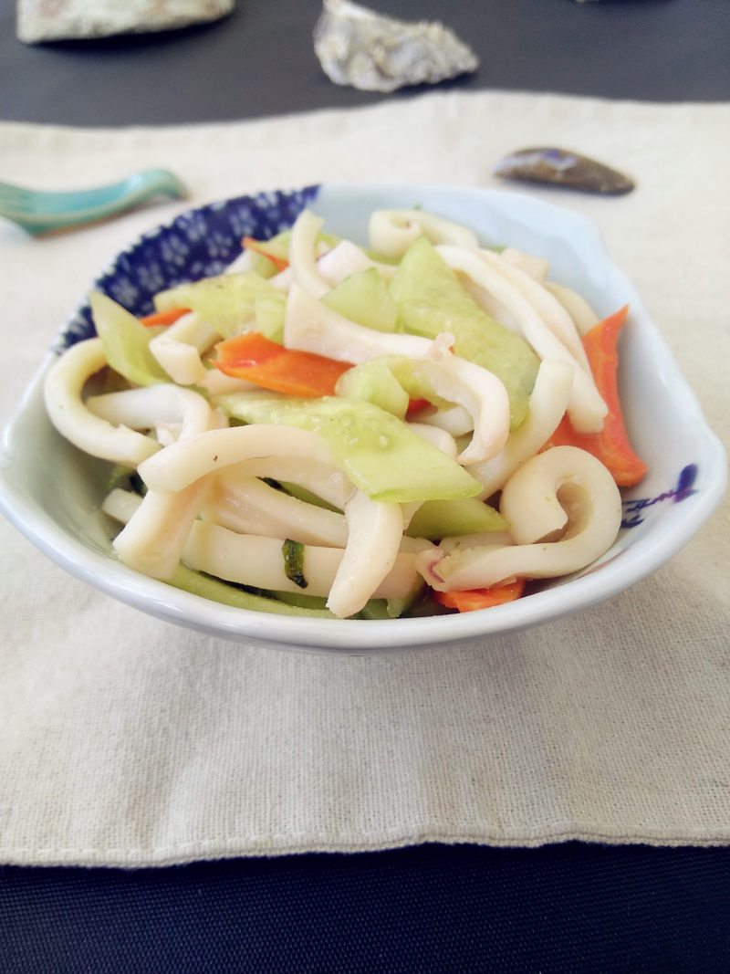 1:鱿鱼摘洗干净。黄瓜、胡萝卜洗干净。