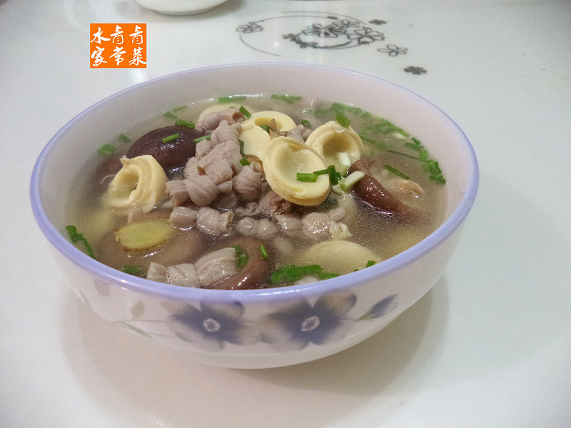 5:先放进香菇,盐煮10分钟后倒蛋卷