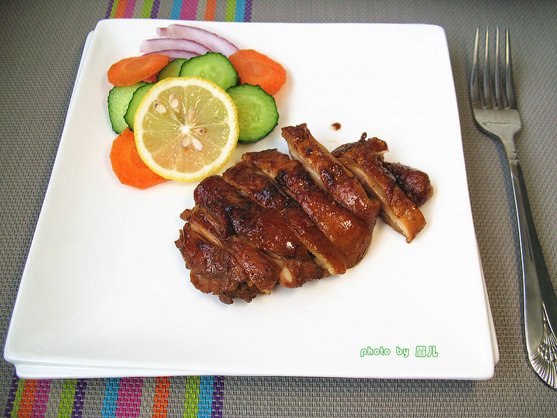 5:将鸡腿用刀背敲一敲,用叉子扎一些小洞,放入盘子里,浇入调料汁,撒入黑胡椒。