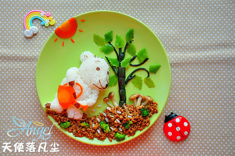 1:现在越来越多的妈妈们热衷于做餐盘画、童趣餐了。这是好事,说明我们越来越多的人更加重视美食艺术了。但是,我还是想说上一句:餐盘画不是用食材单单做成一盘美丽的画就可以吸引人的味蕾那么简单的事的。记得第一次看到网站上一些巧手妈妈做的童趣餐,我是惊呆了,我开始在网上不断地偷师学艺模仿。一开始每做一个餐盘画就有一种成就感,如痴如醉。当然每次也有好多人在欣赏餐盘画的同时,会质疑:“这能吃饱吗?”“这味道能好吃吗?”“估计也是只为欣赏的艺术品吧?”开始的时候,我很逆反这样的声音。但是做的时间长了,我也在深思餐盘画为什么会被人质疑?网上那些餐盘画达人和我自己做的一些餐盘画真的好吃吗?做餐盘画的目的是什么?做餐盘画的目的是为了既好吃又能通过美的画面装饰来让吃的人享受到美食带来的乐趣,餐盘画也需要有很好的菜肴制作技术,然后把制作出来的美食进行画面组合装饰成漂亮的画面。尽管餐盘画装饰美化很重要,但它毕竟是美食的一种外在的包装美化手段,决定其食用价值的还是美食的本身。因此,切不可单纯为了装饰得好看而颠倒主次关系,使美食成为中看不中吃的花架子。没有美味,外在