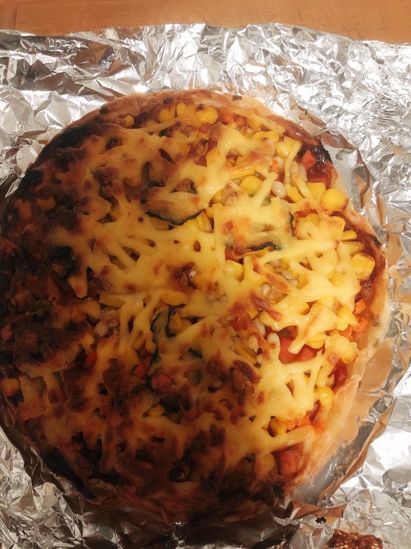 2:火腿胡萝卜切丁,铺在手抓饼上,再厚厚的铺一层玉米粒。