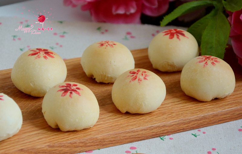 25:用八角背面轻蘸色素,轻轻按在所有的酥皮面球上