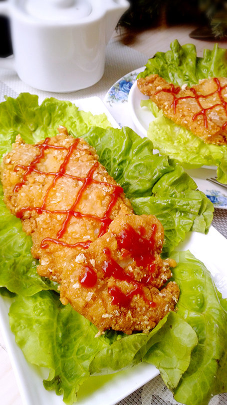 8:炸好的鱼排可以直接吃,也可以挤上番茄酱。
