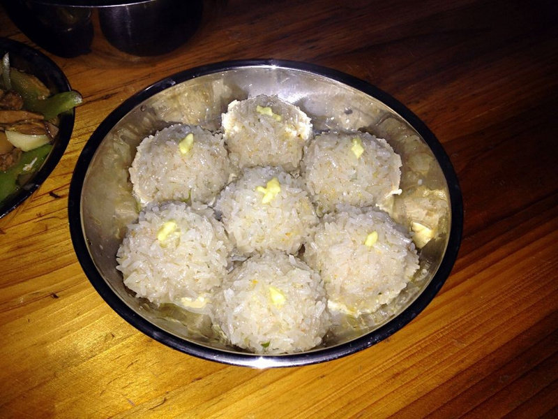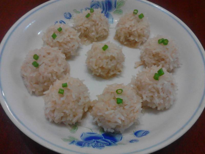 6:做好后,在煮饭的时候同时放进电饭锅蒸,饭熟的时候,丸子也好了。(如果单独下锅隔水蒸煮,也是需时30分钟左右。)
