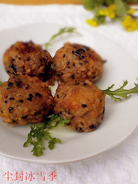 4:取适量肉馅揉成小圆丸子,粘匀糯米轻轻压一下。