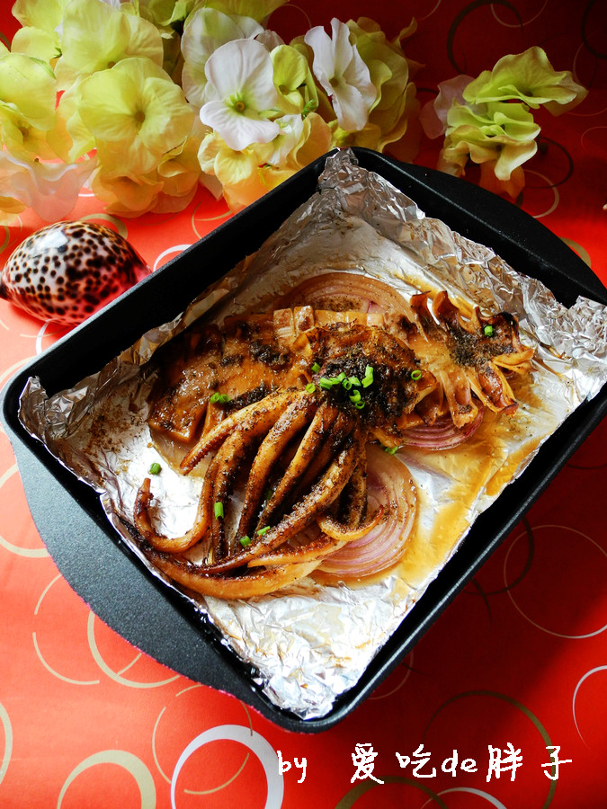 鱿鱼干泡发的时候一定要加一些碱面。烤制时间灵活掌握。