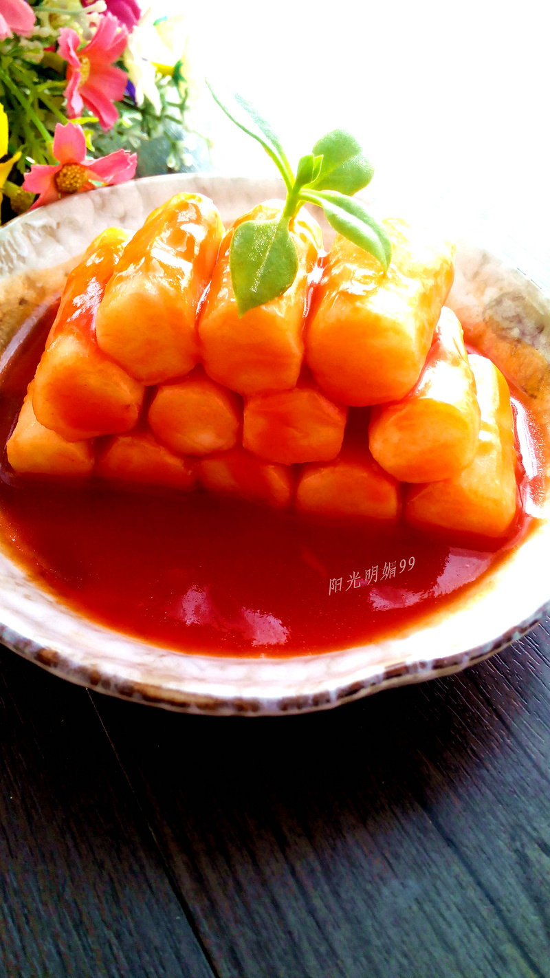 11:成品图,山药装盘,把汤汁淋到山药上。