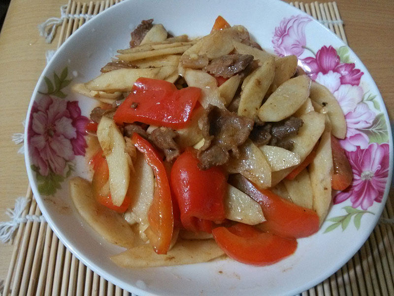 铁棍山药400克;红辣椒1个;猪肉适量;