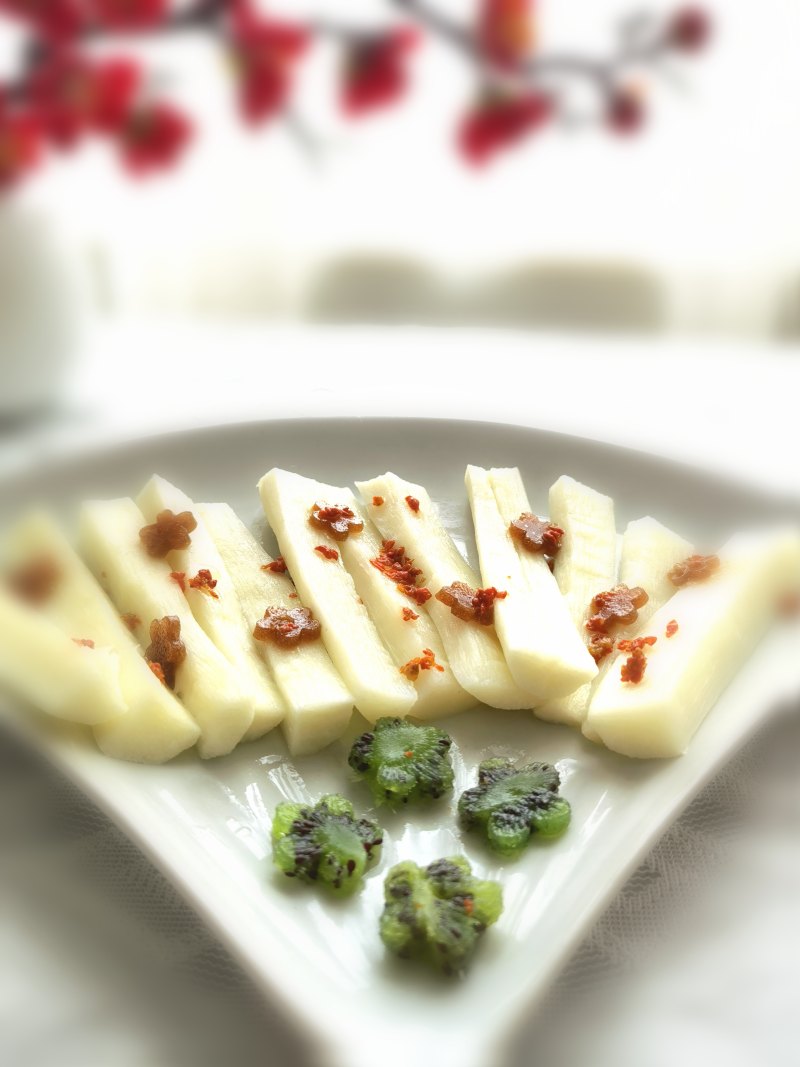 口感:脆嫩绵密,香甜可口。小提示:煮山药时,当水沸腾后要转小火。避免山药煮烂,离火后要马上置于冷水中,可以保持山药的脆感。