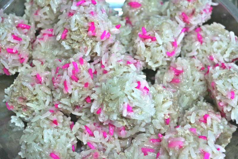 6:取适量的肉馅,在双手之间轻轻摔打成型,然后在阴米里打个滚