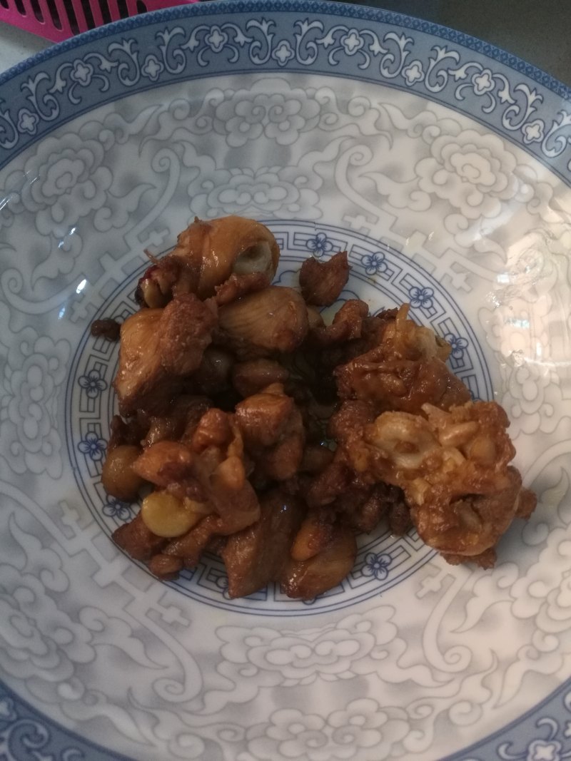 7:放入炸好的鸡腿,翻炒至鸡腿表面均匀的粘上汤汁盖上锅盖,用小火焖10分钟到15分钟左右。揭开锅盖,改用大火收汁儿,放入葱花炒香就可以出锅了。