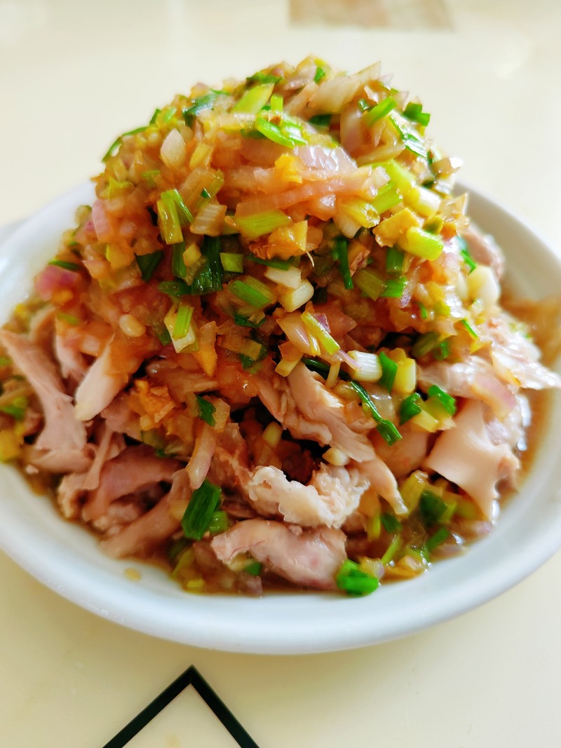 9:把葱油汁浇在鸡肉上面,淋上香油就好了,吃的时候,拌匀即可食用。