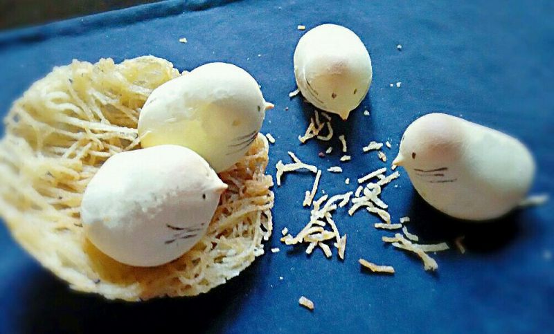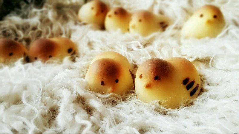 12:冷却之后,融化一些黑巧克力,用牙签沾着巧克力液画出小鸡的眼睛和羽毛纹路即可