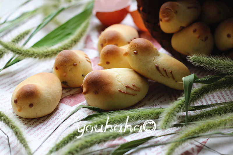 7:将造型好的小鸡面坯,放入铺好的油纸的烤盘