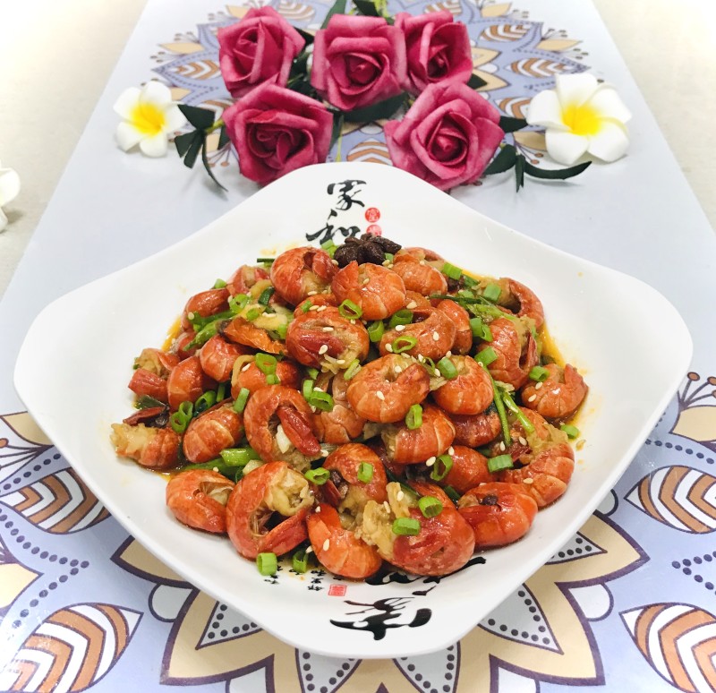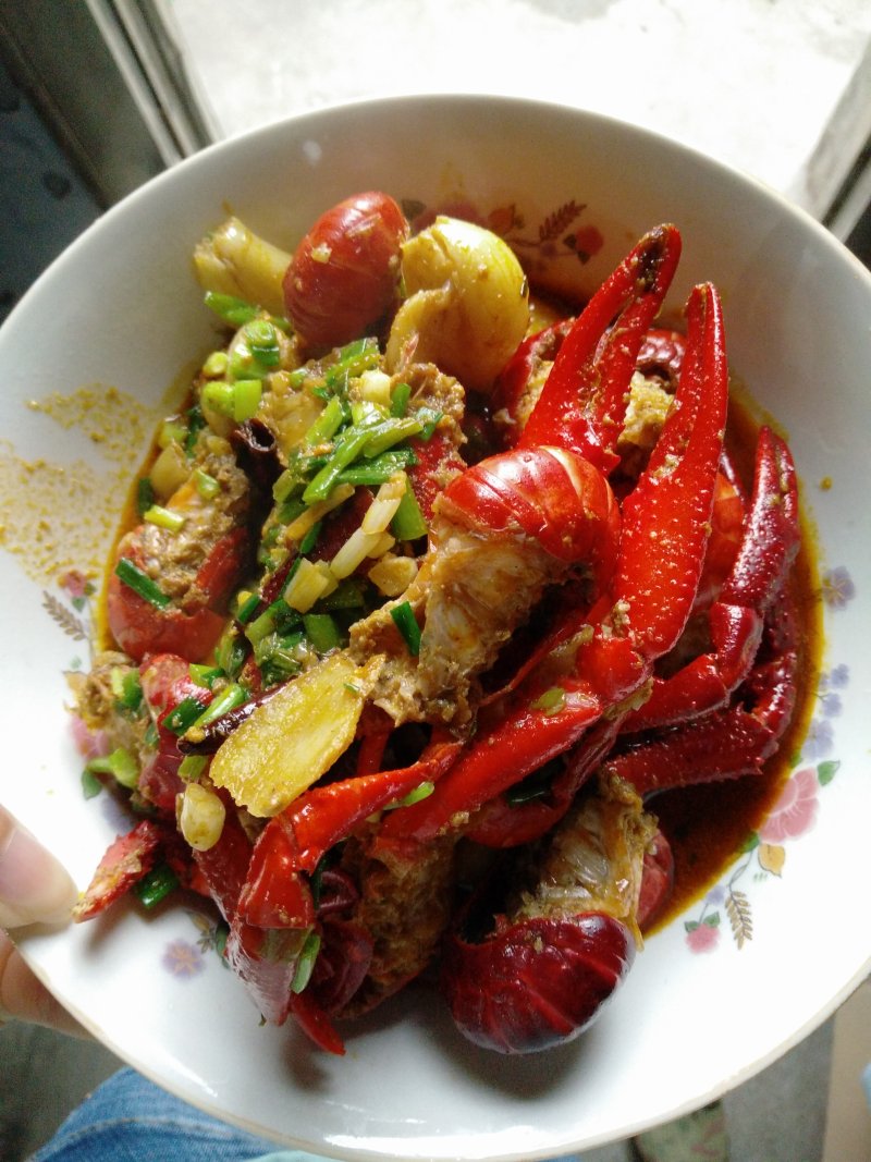 4:锅内放入油,油热后下生姜,蒜,大葱、花椒,海椒,炒一会儿,下小龙虾,加盐、生抽,变色后下味精,。差不多中火炒3-5分钟后下糖醋起锅。